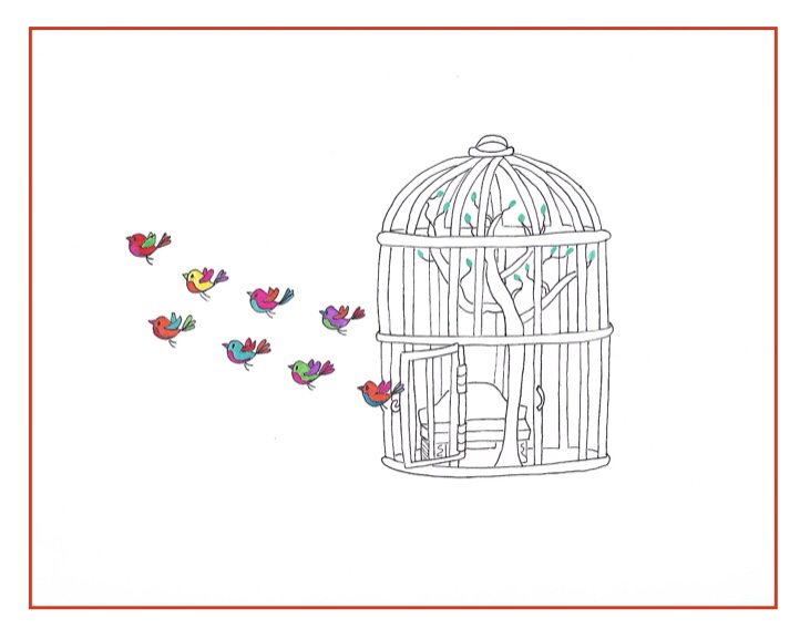 Back to skipping along the path, we come to a giant golden bird cage, glittering in the sunshine. Inside are hundreds of colorful birds, about the size of our hands. We are in love! Serena reaches for the door to pull it open so we can go inside, but when she does, all of the birds come flying out at once! Our eyes grow round as saucers and our mouths fly open. We are in big trouble now! We go inside and sit on the golden bench. Serena is thinking hard how to fix this ourselves. I can see the wheels turning in her head as her hair begins to curl. I say, “We need My Lord RIGHT NOW!”