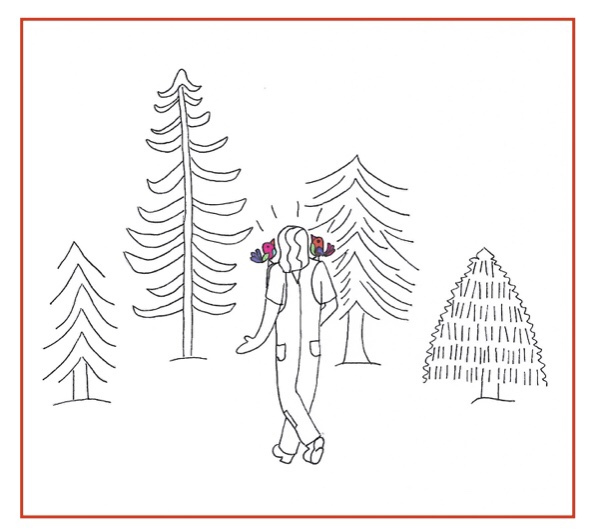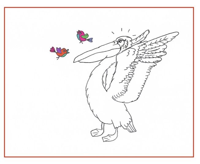 A shimmer appears in the air and turns into a 6’4” pelican. We fall to our knees and bow our heads. Serena cries, “My Lord, we just wanted to come inside to look at the birds and they all flew away! We are so sorry!” The pelican pecks us each on the head once and it really hurts! I see the air around us begin to shimmer and suddenly we are tiny colorful birds ourselves! This is glorious! We can sing the most beautiful songs now!