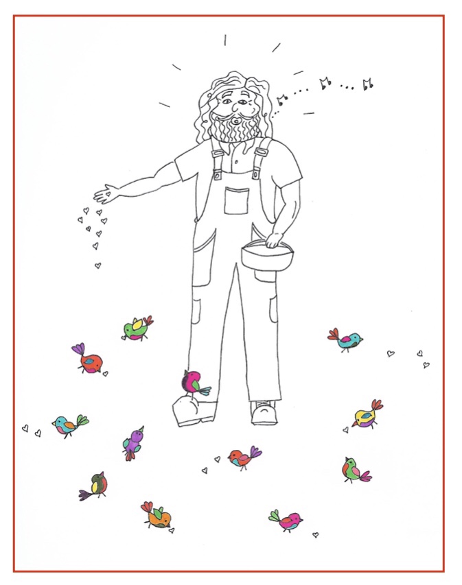 We try to fly and bump into each other a few times but quickly figure it out. We fly in circles around My Lord’s head and he bats at us with his enormous beak. My Lord squawks and we know we are supposed to go look for the other birds. We fly through the garden to the other side of the lily pond where we see a colorful carpet of birds all around Father’s feet. He bedazzles us with his light. He is whistling a happy tune and tossing out handfuls of birdseed.