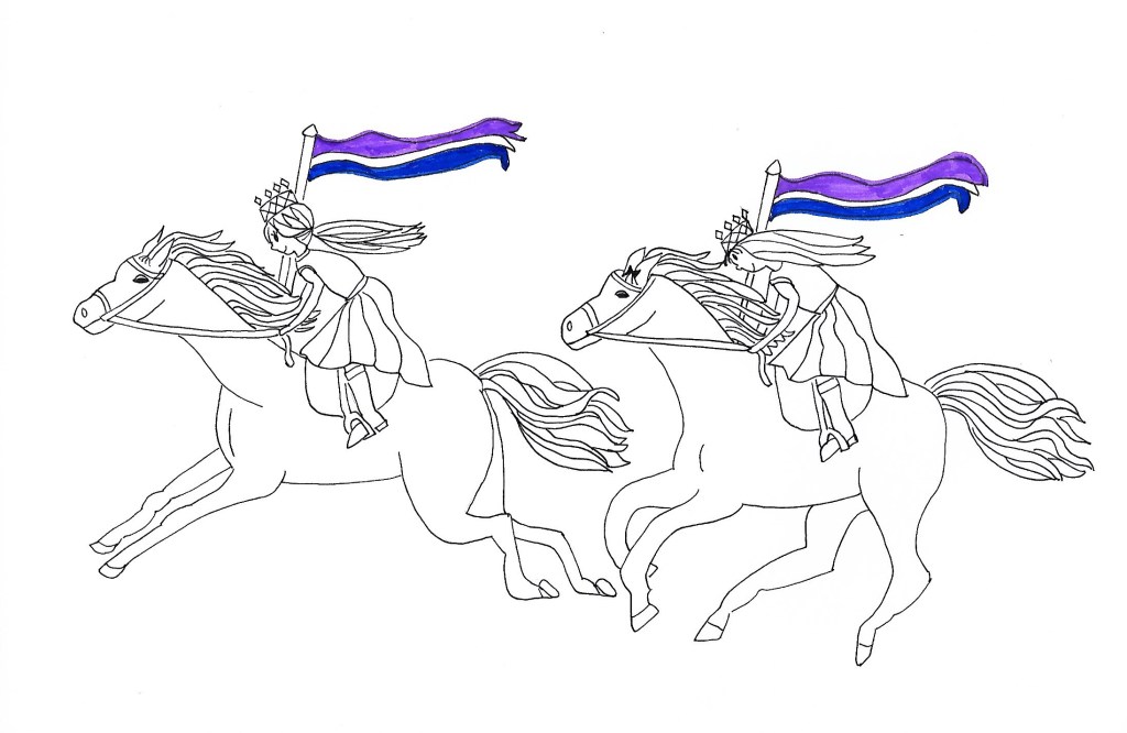 In my imagination, I see… Serena and myself nearly seated on two sleek chestnut racing horses, thundering across the beach of my heart. The sun is dawning, painting the sky glorious in shades of orange and rose. A gray-blue sea delivers her crashing white waves to our feet. We streak past with heads bent low, hair streaming, and backsides lifted. Today we wear sleeveless white dresses with golden brocade bodices and white chiffon skirts. Golden suede boots, and golden crowns complete our dazzling attire. Each horse carries a long walnut pole topped with streamers of purple, diamond white, and royal blue, unfurled in splendor. A sense of mission, expectancy, and rightness fill the air! I wonder where we might be going…